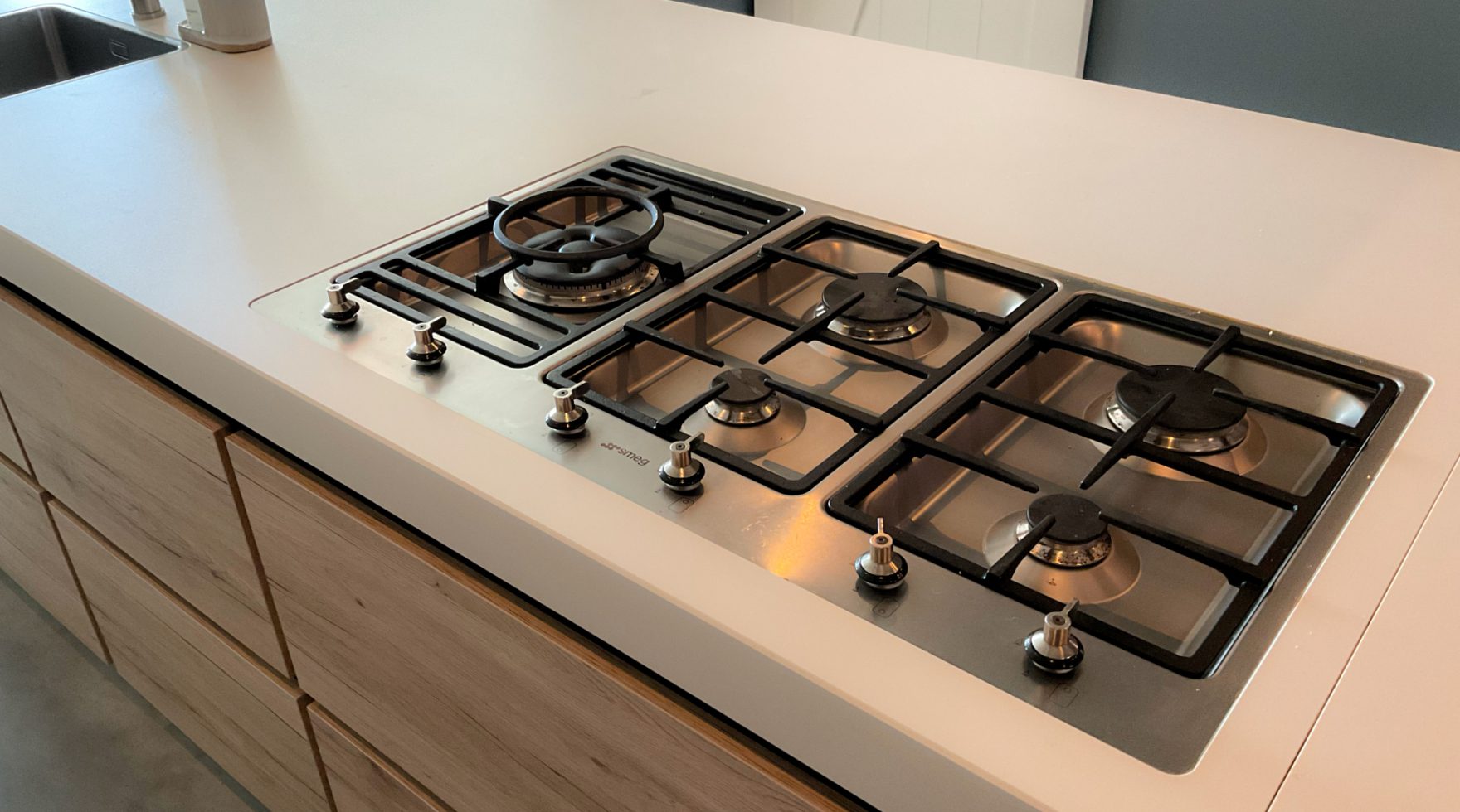 Een opvallend detail: in hun boerderij wilden Laurens en zijn gezin geen standaard geïntegreerde afzuigkap. “We kozen voor een grote afzuigkap boven het fornuis. Veel knusser, en het past perfect bij de uitstraling van ons huis.”