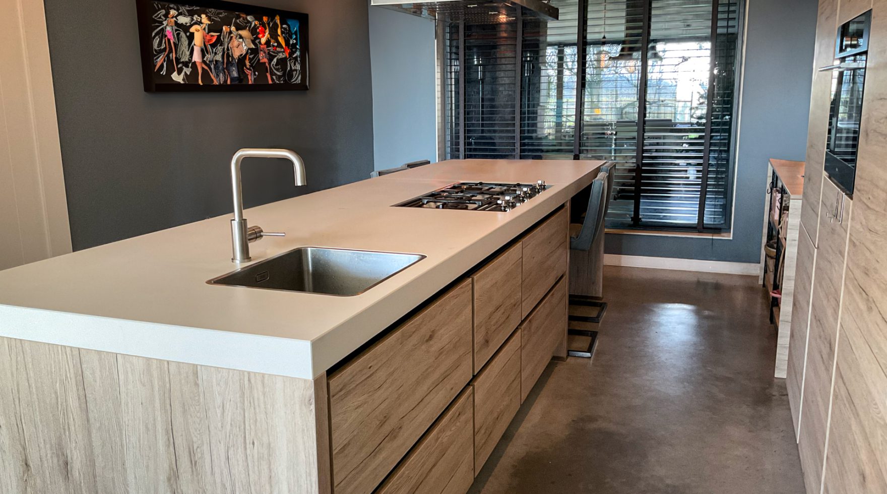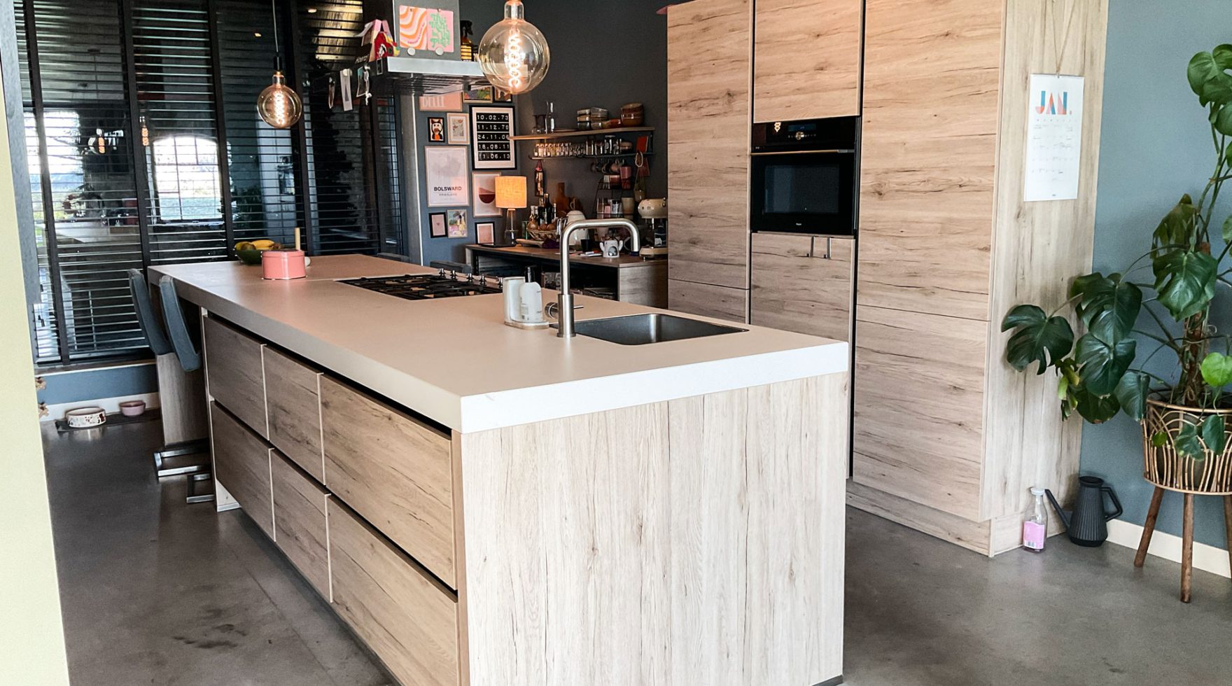 De kracht van Keukenpunt zit volgens Laurens in de persoonlijke aanpak. “Ze denken verder dan de standaard mogelijkheden. Onze keuken heeft een blad van 3,5 meter, en we wilden daar ruimte voor zitjes. Dat is naadloos in het ontwerp verwerkt.” Ook de materialen en kleuren werden zorgvuldig afgestemd. “We kregen stalen mee naar huis om te zien hoe alles zou matchen met onze betonnen vloer. Keukenpunt heeft zelfs – buiten de standaard. onze handgrepen zwart gemaakt – zodat ook die helemaal in de stijl van ons huis pasten.”